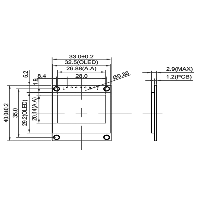 This OLED module is designed with flexibility in mind, offering an IPS (In-Plane Switching) viewing direction for consistent image quality from various angles. It measures just 33.0mm in length, 40.0mm in width, and has a depth of only 3.0mm, making it a perfect fit for applications where space is limited. The display provides excellent visual clarity with a pixel pitch of 0.21x0.21mm, ensuring sharp and detailed graphics.