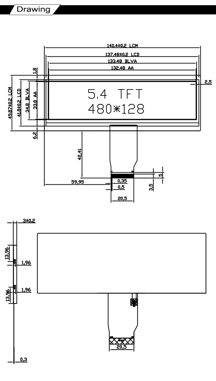 The HT054WQI‑B4085‑02 is designed as a bar‑type (elongated horizontal aspect) TFT LCD module. It measures 140.4 × 49.87 × 3 mm overall (outline dimension) and offers an active image area of 132.48 × 33.8 mm. The resolution of 480 (horizontal) by 128 (vertical) pixels provides a wide, slender display suitable for banner‑style or status‑bar style UI layouts. The module uses amorphous silicon (a‑Si) thin film transistor technology and adopts an IPS (in‑plane switching) viewing direction to ensure consistent visual performance across the width of the bar.