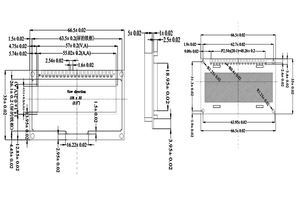 The 2.23-inch OLED display module described here adopts a 128×32 dot matrix architecture driven by SSD1305 or SSD1309 controllers, supporting Parallel, SPI, and IIC interfaces through a 20-pin configuration. Designed as a passive matrix display, it offers monochrome output in multiple color options (white, blue, yellow/green), with a wide viewing angle and robust environmental tolerance ranging from -40℃ to 80℃ in operation. Its compact mechanical outline (66.5 × 35.0 × 8.8 mm) and finely defined pixel structure ensure suitability for embedded systems requiring stable and efficient visual output.