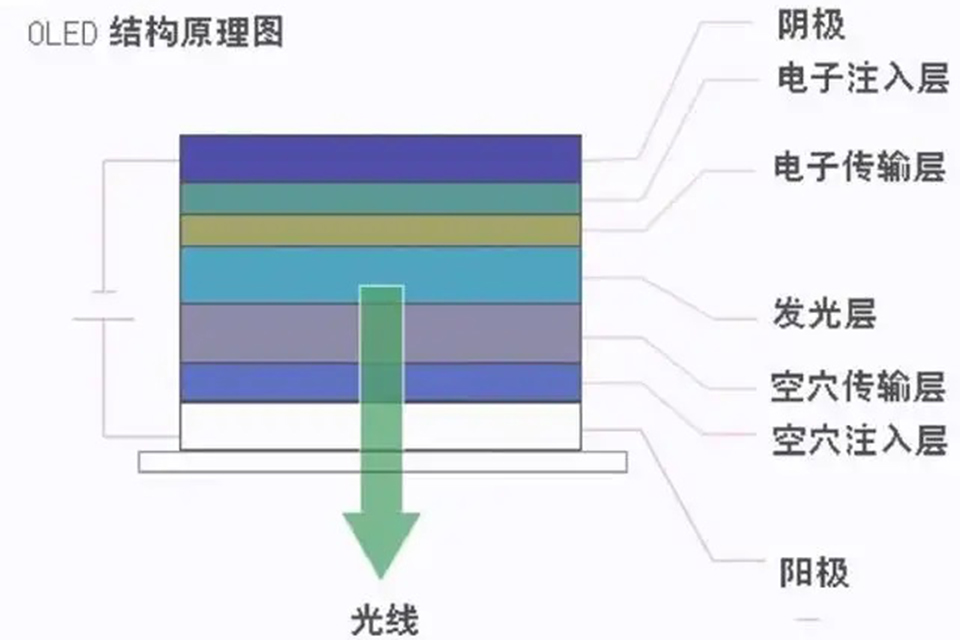 The main structure of an OLED consists of an organic light-emitting layer and a glass substrate.