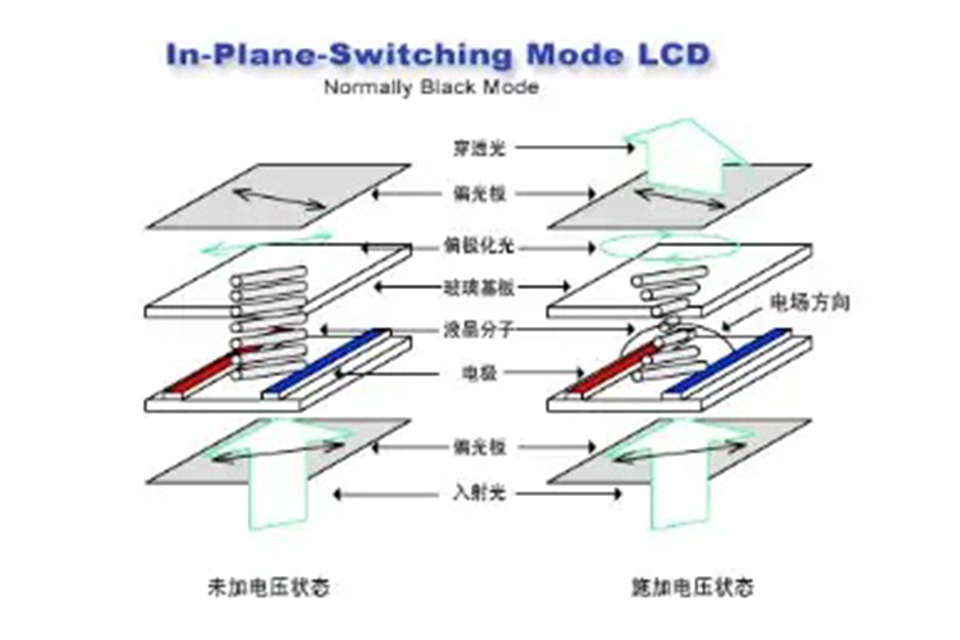 Its principle is: to improve the viewing angle by switching the liquid crystal molecules in a planar manner, utilizing spatial thickness, friction strength, and effectively using the change driven by the lateral electric field to allow the liquid crystal molecules to rotate at the maximum planar angle to increase the viewing angle; IPS changes the arrangement of liquid crystal molecules and the distribution of electrodes, and the working conditions are also changed. When no voltage is applied, the liquid crystals do not rotate at all, and the two orientation layers are perpendicular to each other, displaying a relatively pure black. After applying voltage, the liquid crystal molecules rotate to a vertical position, allowing light to pass through. This results in a wider viewing angle, higher contrast, higher resolution, and brighter color display.