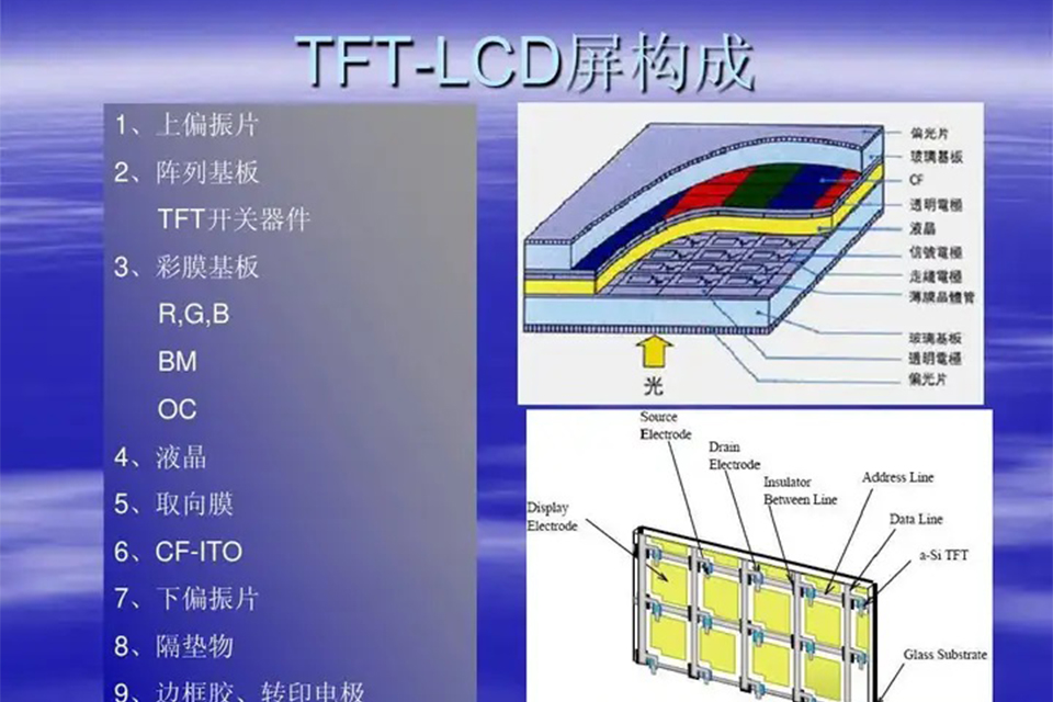 The main function of a thin-film transistor liquid crystal display is to use thin-film transistors to generate voltage to control the orientation of the liquid crystals. The main feature of TFT-LCD is that each pixel is equipped with a semiconductor switching device. Because each pixel can be directly controlled by a point pulse, each node is relatively independent and can be continuously controlled. This design method not only improves the response speed of the display screen but also allows for precise control of the display grayscale. TFTs have the characteristics of large area, high integration, powerful functions, low cost, flexible process, and wide application fields.