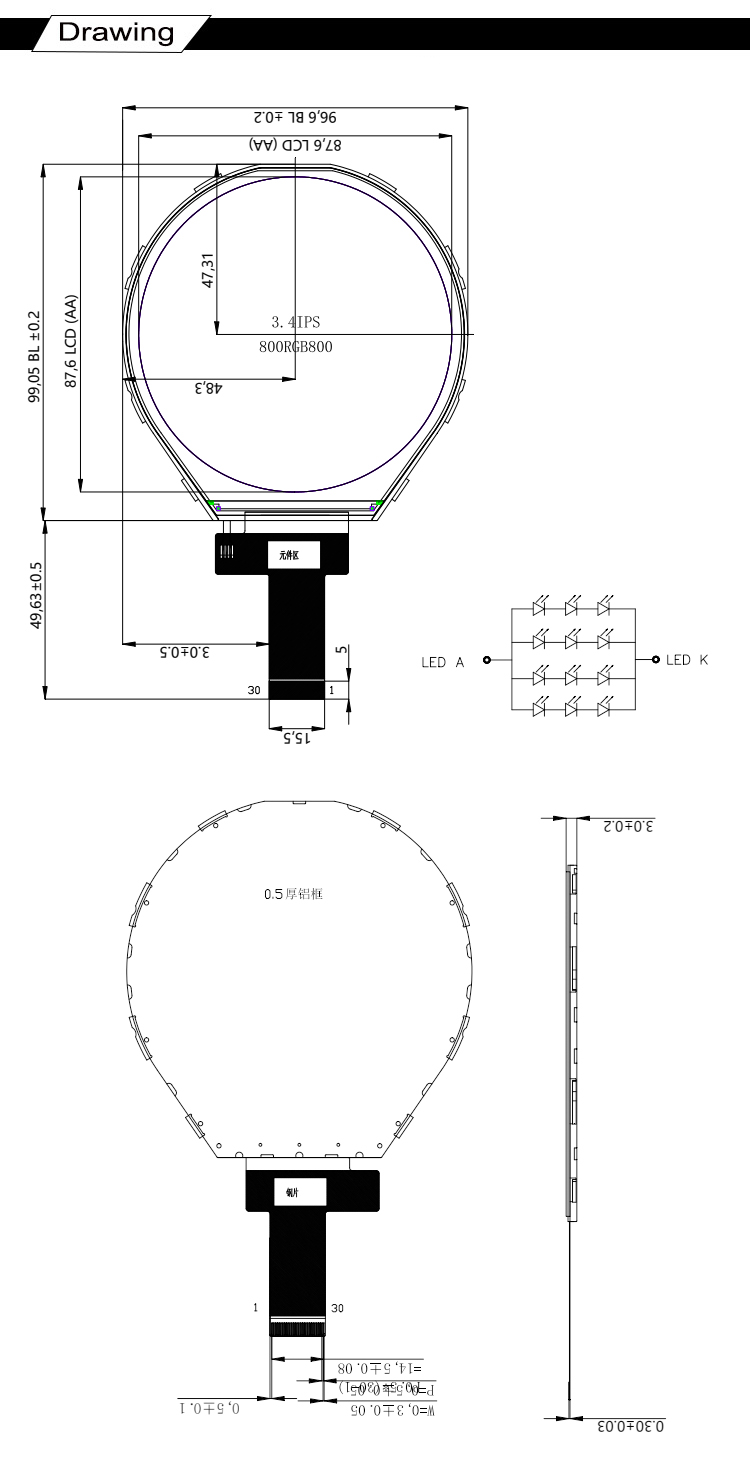 Hicenda HT034WX-B303-002 is a 3.4-inch circular TFT LCD display module featuring a high-resolution 800×800 pixel matrix and MIPI interface. This transmissive a-Si TFT display adopts IPS technology, ensuring consistent image clarity across wide viewing angles. Designed without touch panel support (TSP), it delivers a normally black display mode and operates within a robust temperature range. With 16.7M color depth, monochrome display options, and compact integration features, it offers a compelling solution for next-generation circular interface devices.