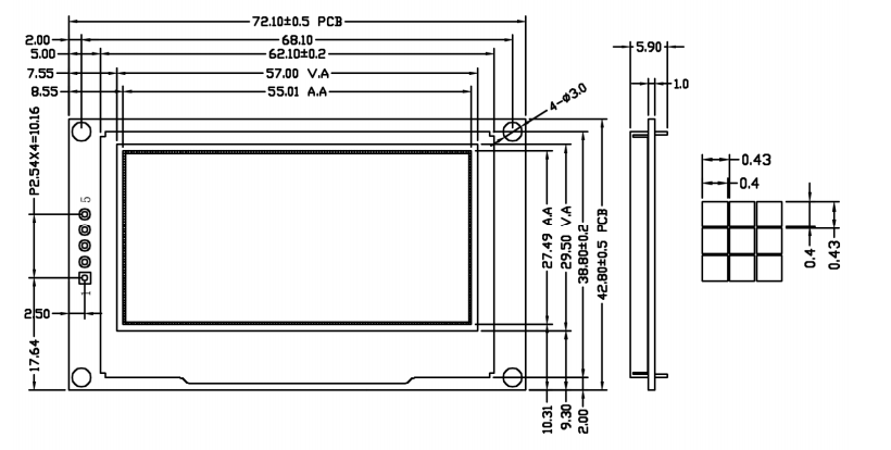 The active display area measures 55.01 × 27.49 mm, enclosed within a viewing area of 57.01 × 29.5 mm. With a pixel size of 0.39 × 0.39 mm and a pitch of 0.43 mm, the display achieves uniform luminance and precise image rendering. The 1/64 duty driving scheme further contributes to stable operation and consistent brightness distribution.